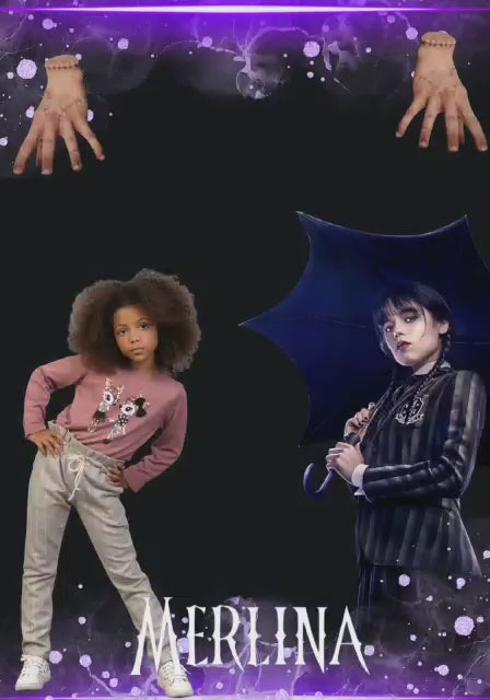 Celebra el cumpleaños de tu pequeña con nuestra tarjeta de invitación temática de Merlina.